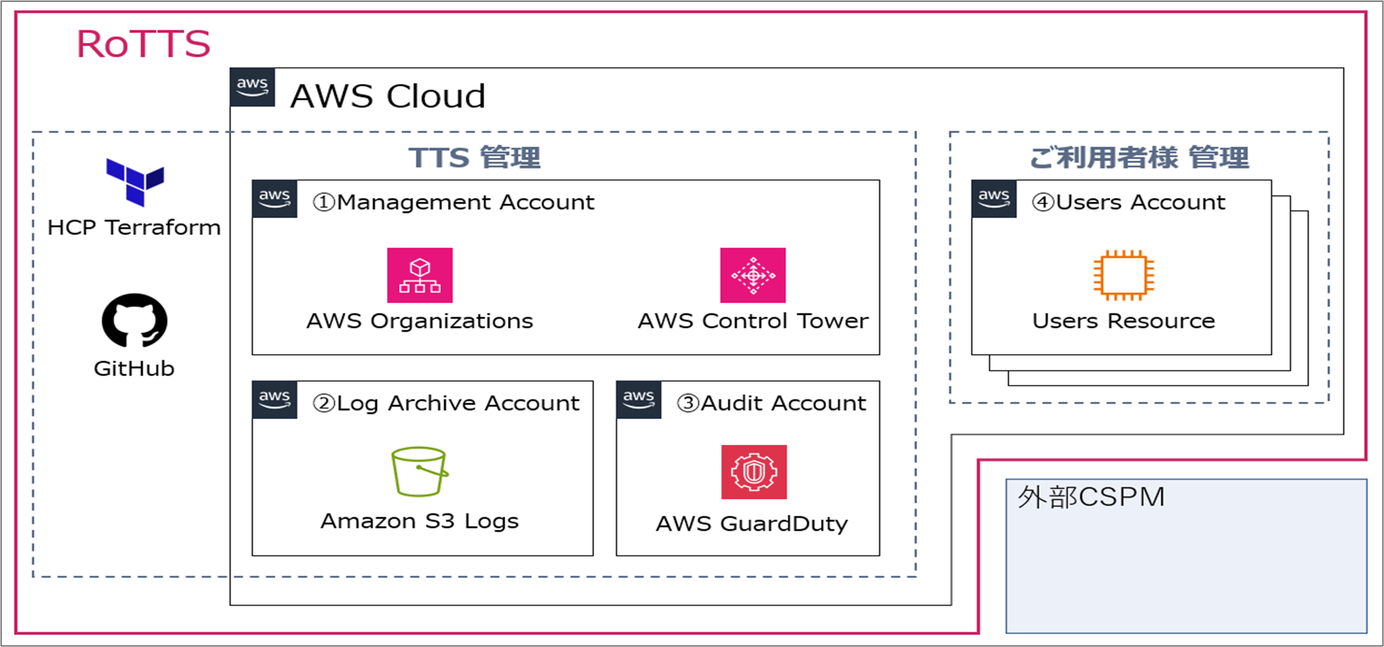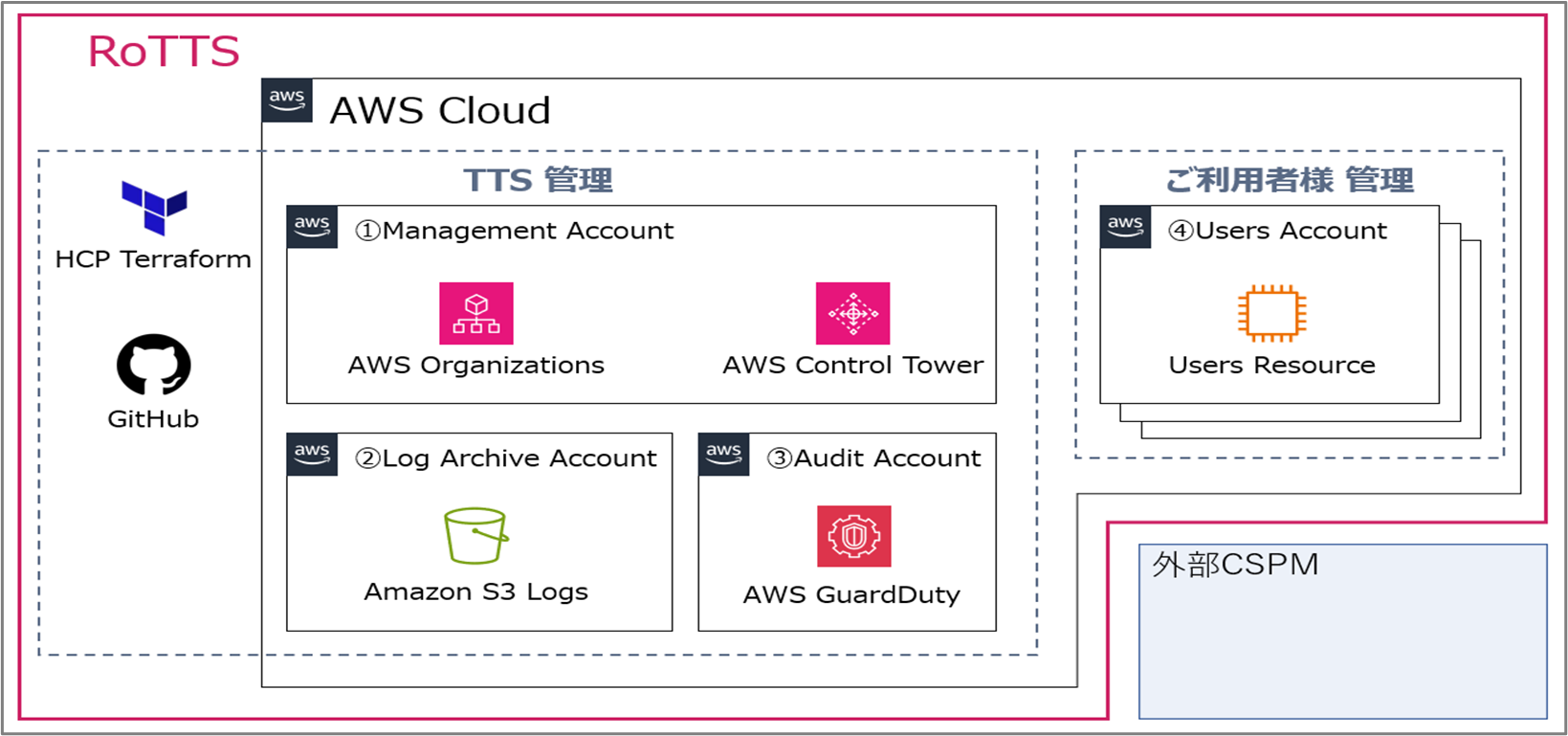クラウド基盤構築の課題解決のため、豊田通商システムズにてトヨタグループ向けに展開されている、セキュリティ設定済みのAWSアカウント提供サービス「RoTTS」を採用しました。「RoTTS」により、ゼロからのクラウド環境構築ではなく、セキュリティのベースラインを引き上げた状態でAWSを利用できます。