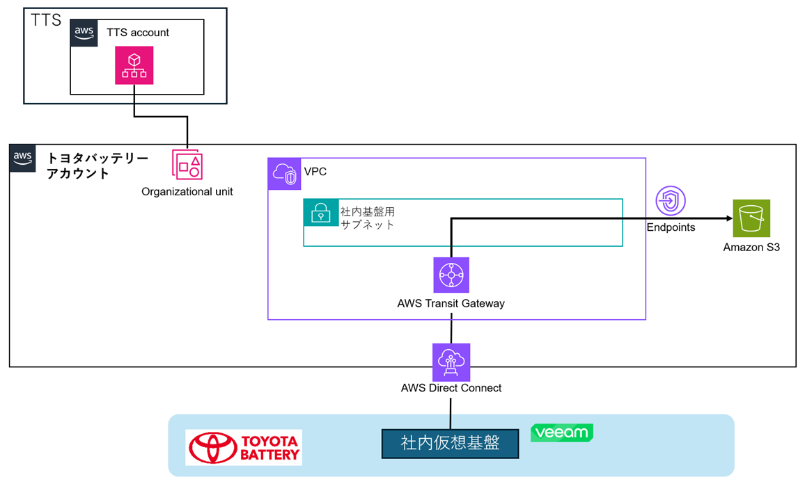 現在、NW環境などのAWS利用環境の構築が完了し、第一歩として、オンプレミス基盤の二次バックアップ先として利用しています。オンプレミス環境のデータを、バックアップツール(Veeam)を利用してAWSに保存し、大規模な災害やサイバー攻撃発生時にも社内システムのデータが保護される様にしています。